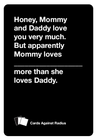 The Card Czar shuffles all of the answers and shares each card combination with the group. For full effect, the Card Czar should usually re-read the Black Card before presenting each answer. The Card Czar then picks a favorite, and whoever played that answer keeps the Black Card as one Awesome Point.